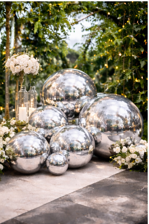 Sublimez vos événements avec nos boules décoratives argentées effet miroir, véritables éléments de design à l’esthétique contemporaine. Leur finition brillante capte la lumière et crée une ambiance élégante et sophistiquée, idéale pour des mises en scène d’exception.